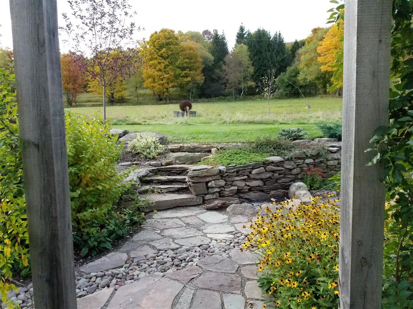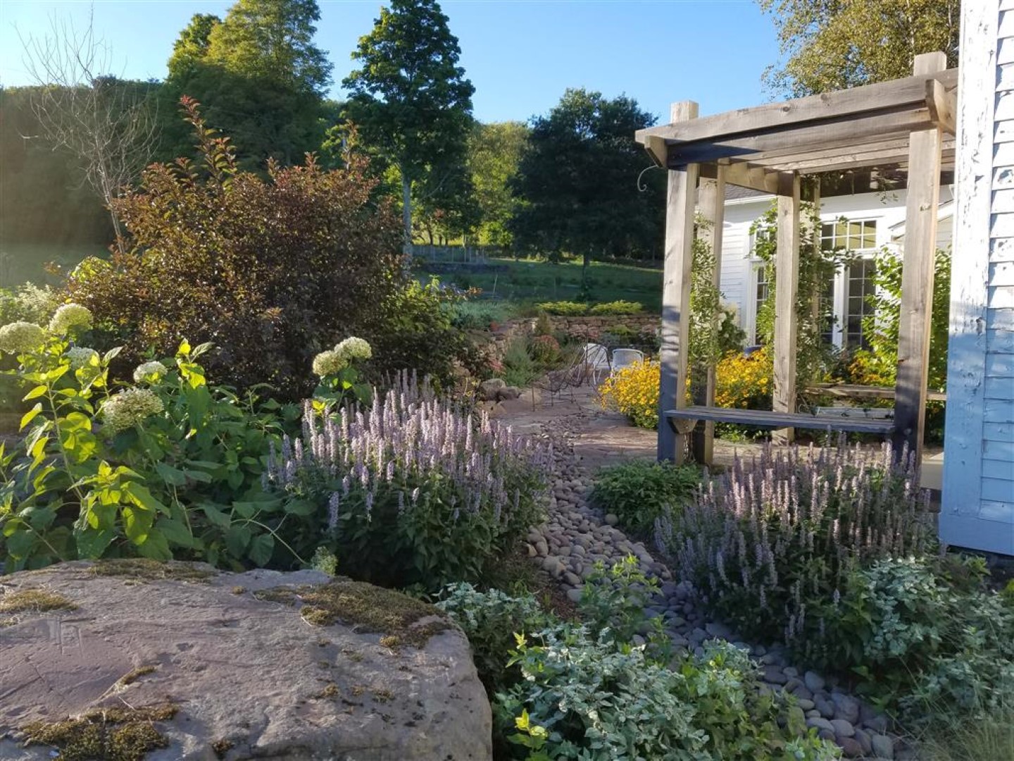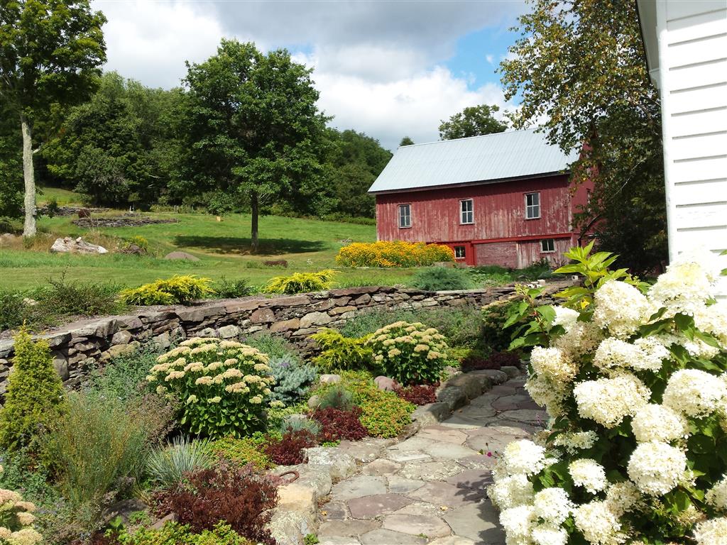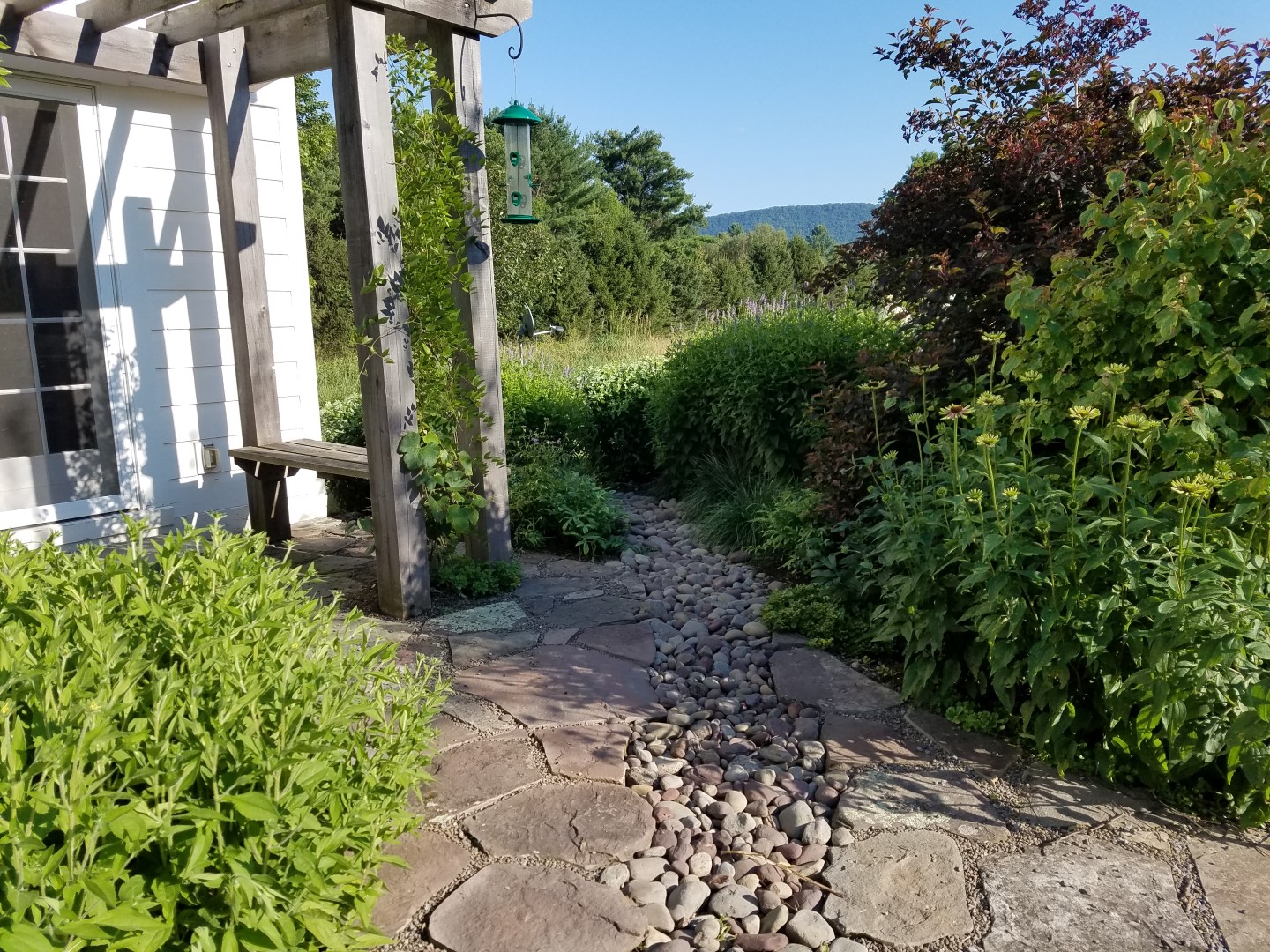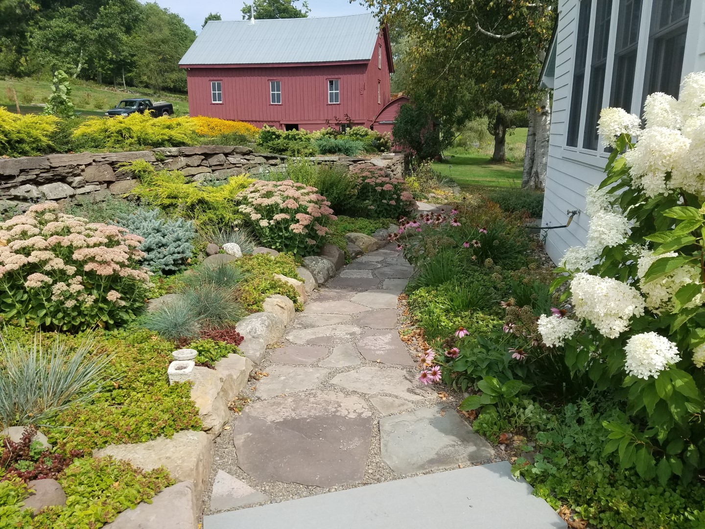 We have been working on the property since 2012. The clients love this amazing old farm and are having a blast creating new interesting areas and destinations. This past year we added a water course that is mostly spring fed from the original spring house up the hill as well as the “ledge” and “scree” gardens behind the barn. The owner came up with name for his property and it reflects our shared approach to creating beautiful architectural lines for the beds, paths and walls as well as layering the sight lines as you take in the long views.