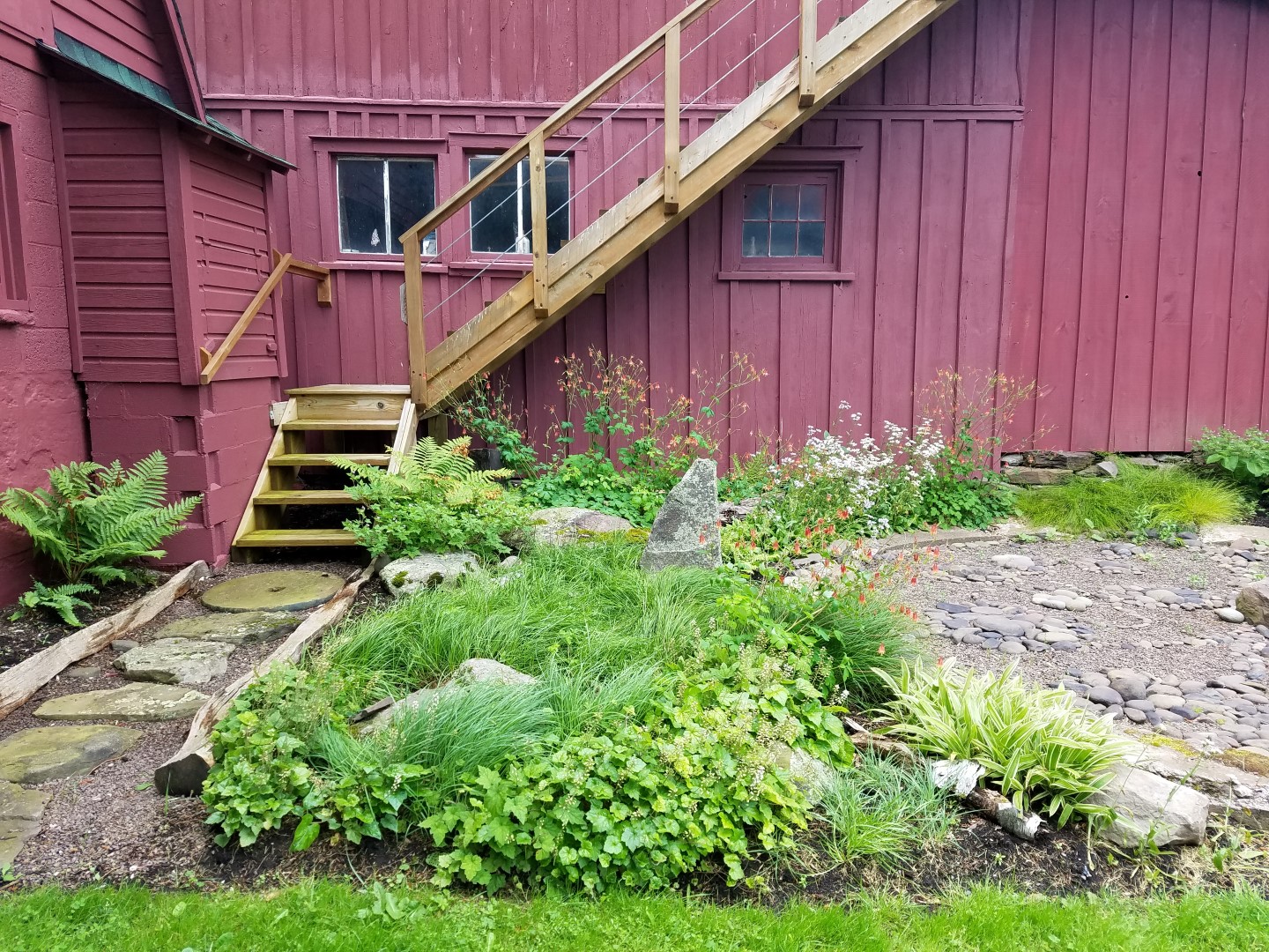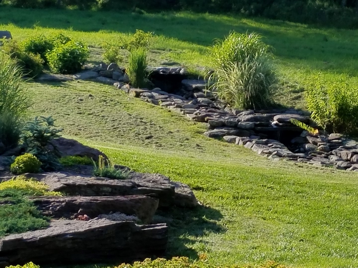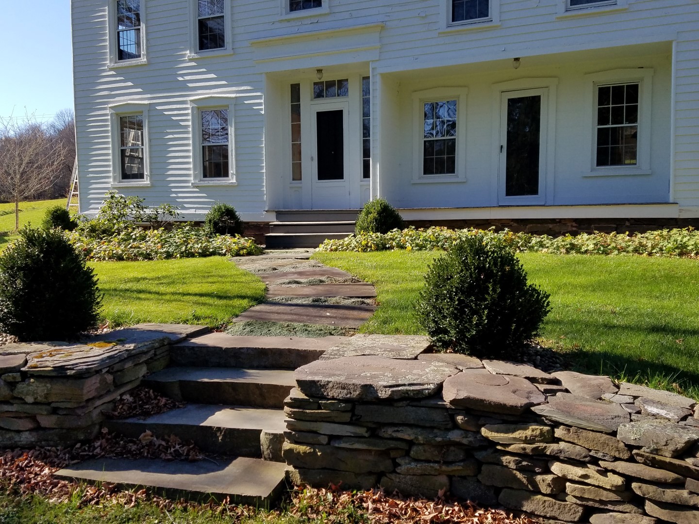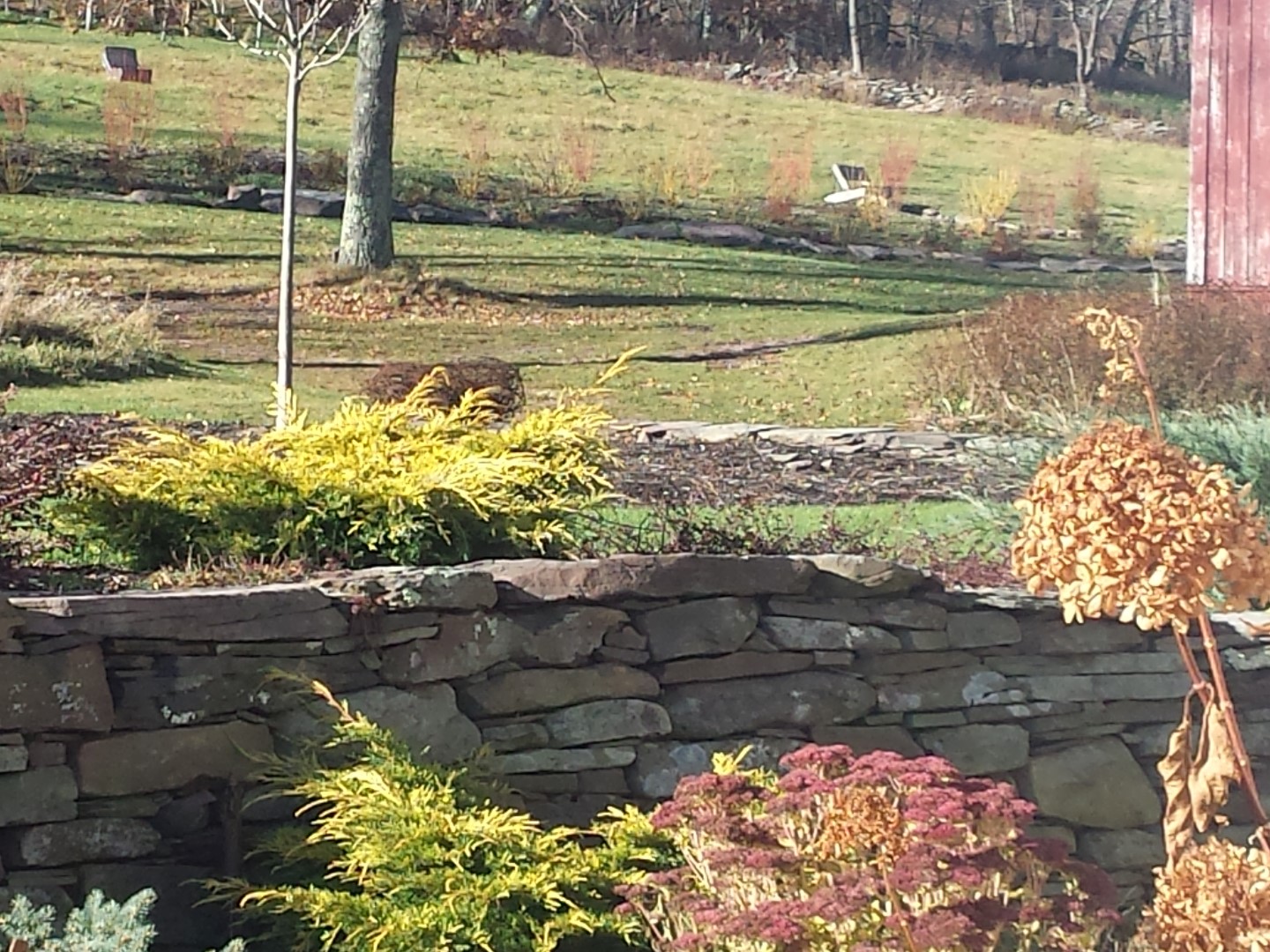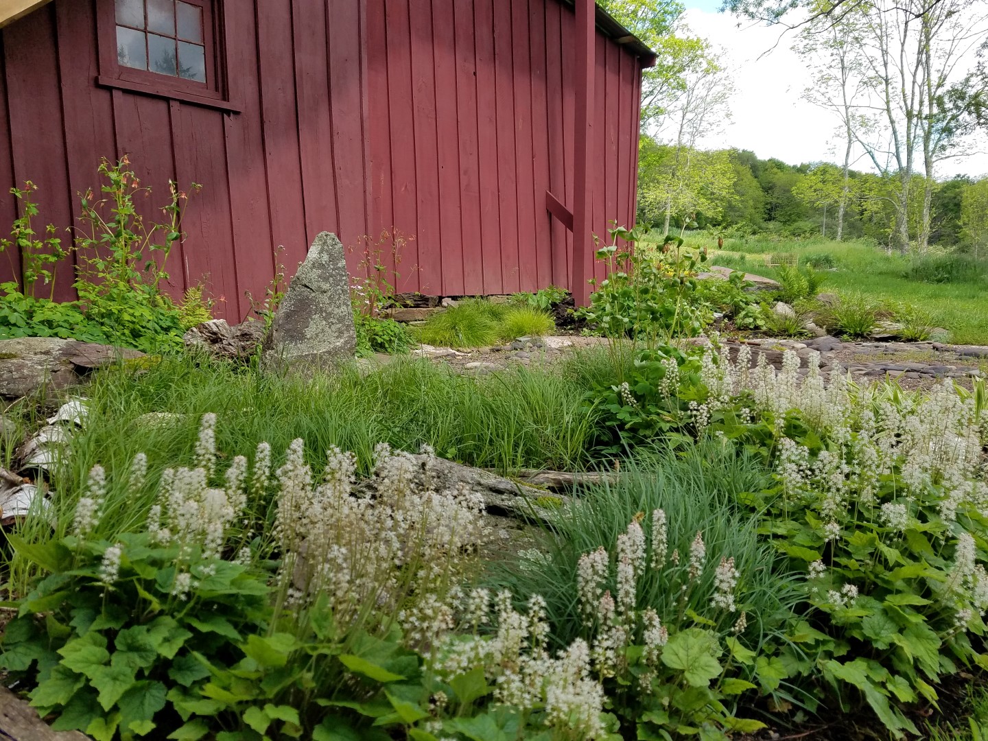 We have been working on the property since 2012. The clients love this amazing old farm and are having a blast creating new interesting areas and destinations. This past year we added a water course that is mostly spring fed from the original spring house up the hill as well as the “ledge” and “scree” gardens behind the barn. The owner came up with name for his property and it reflects our shared approach to creating beautiful architectural lines for the beds, paths and walls as well as layering the sight lines as you take in the long views.