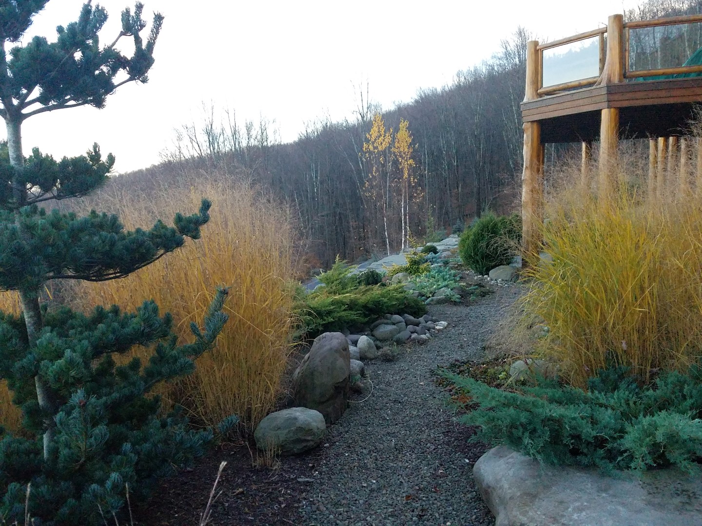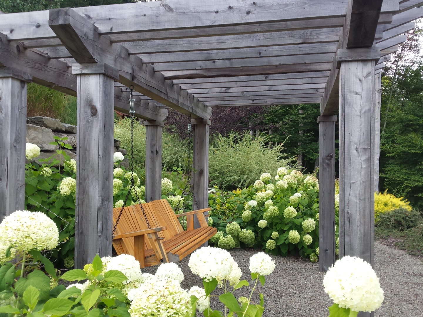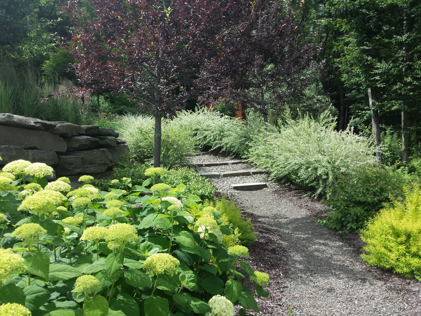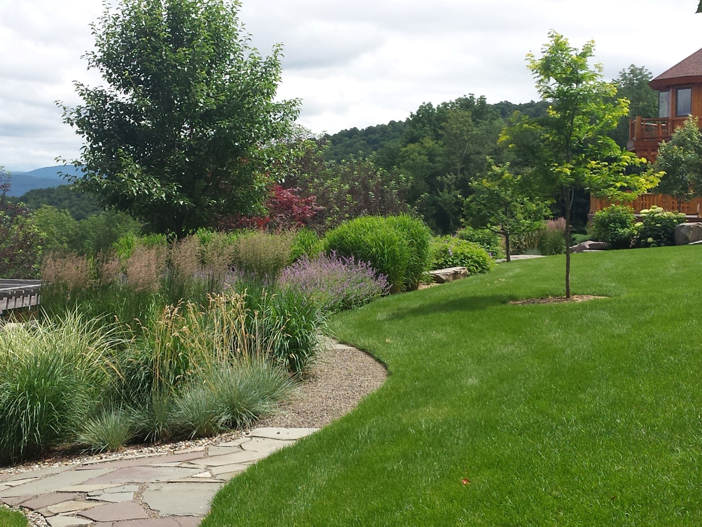The project included a large blue stone patio integrated into a deck for a dining and lounging area with a fire pit. There is a stroll garden that traverses the 2 level garden leading through mass plantings of perennials and grasses on the upper level and trees and shrubs on the lower level. The stroll passes by a destination pergola with a 3 person swing and then by a set of native stone steps to return to the patio. You can also continue on through a rock garden hugging the side of the cliff-like retaining wall to a grassy knoll leading up to the parking court.