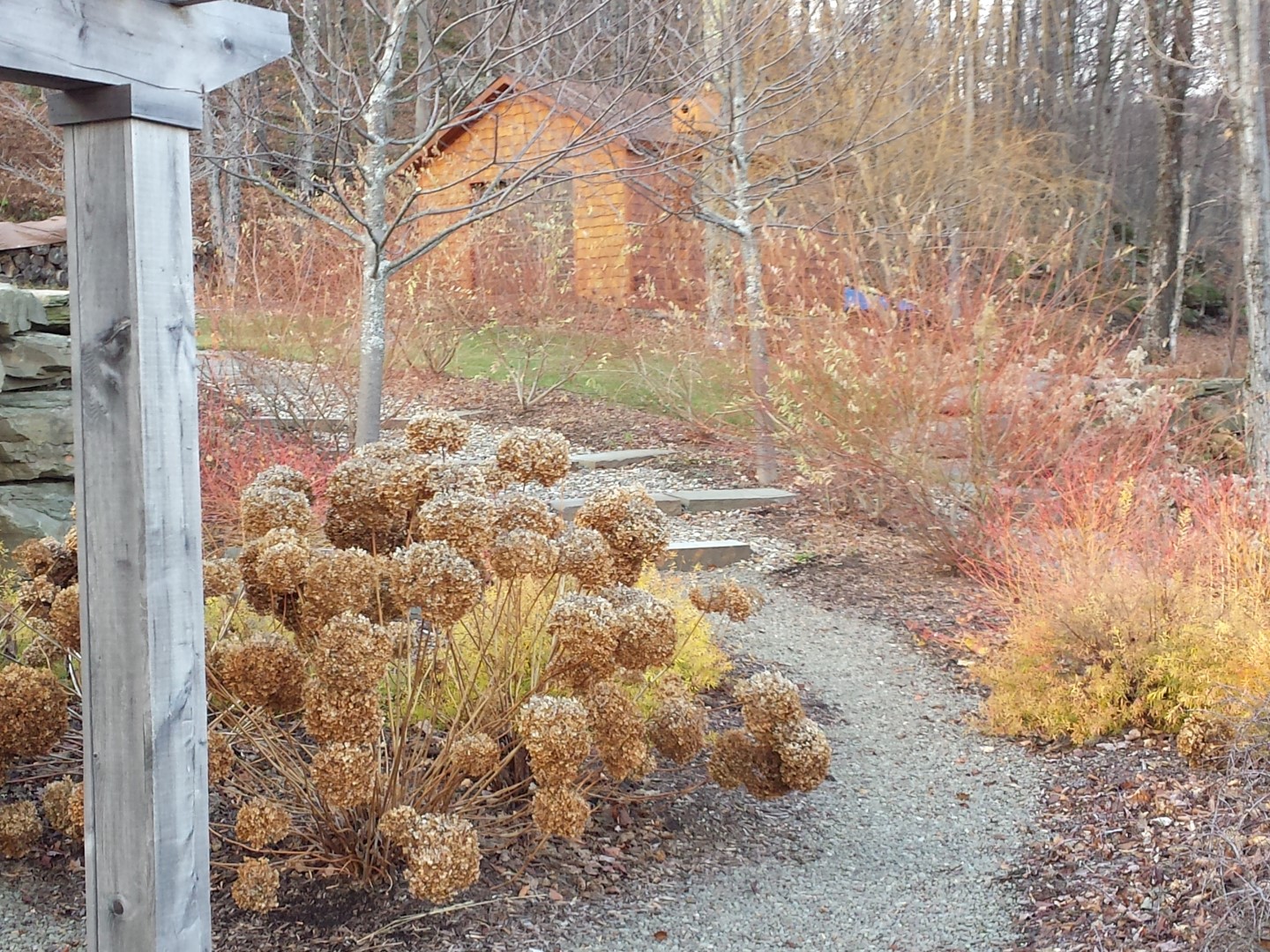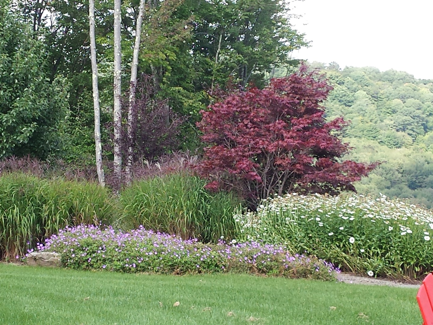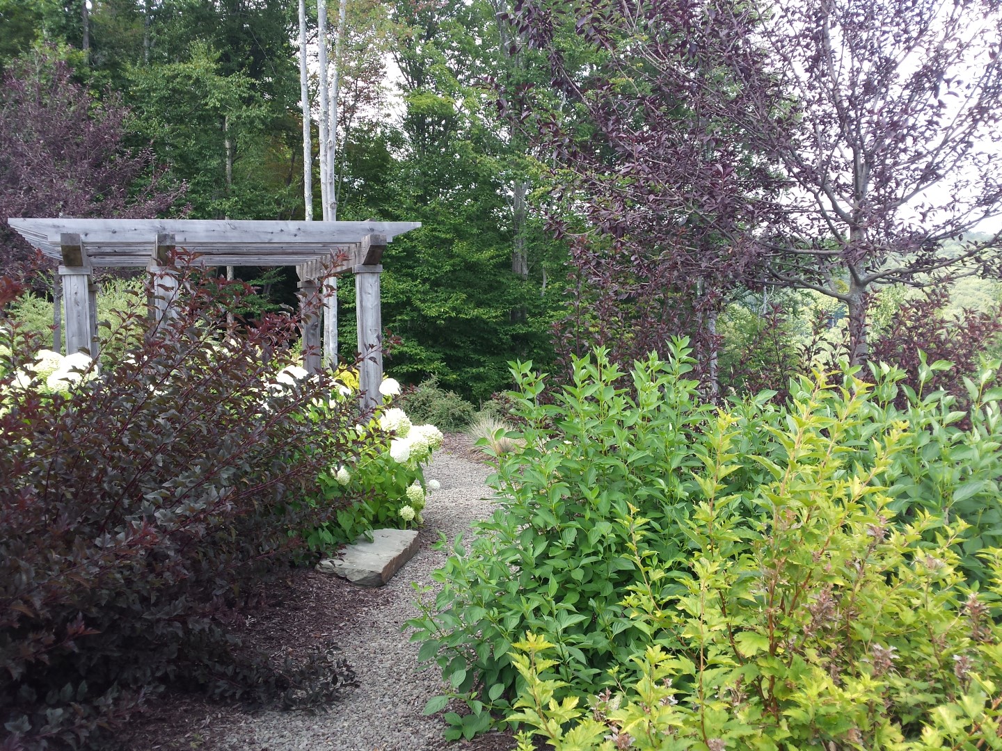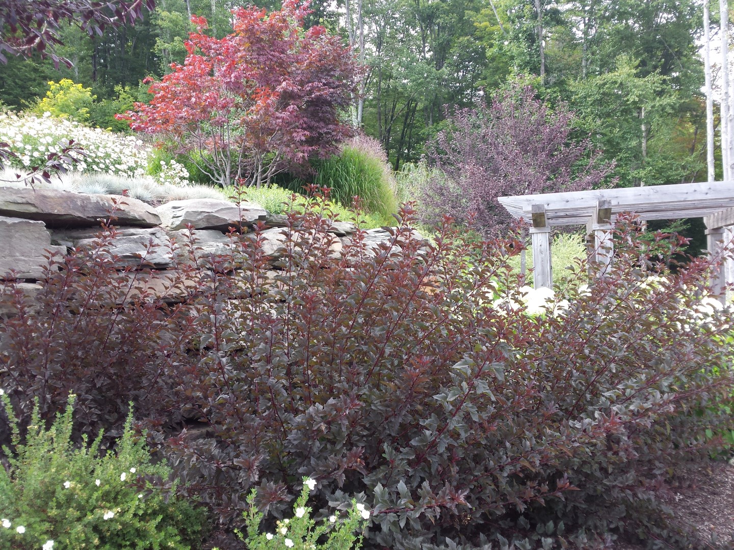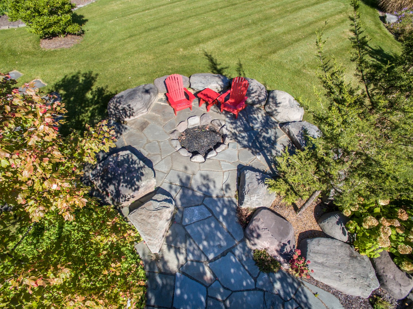 The project included a large blue stone patio integrated into a deck for a dining and lounging area with a fire pit. There is a stroll garden that traverses the 2 level garden leading through mass plantings of perennials and grasses on the upper level and trees and shrubs on the lower level. The stroll passes by a destination pergola with a 3 person swing and then by a set of native stone steps to return to the patio. You can also continue on through a rock garden hugging the side of the cliff-like retaining wall to a grassy knoll leading up to the parking court.