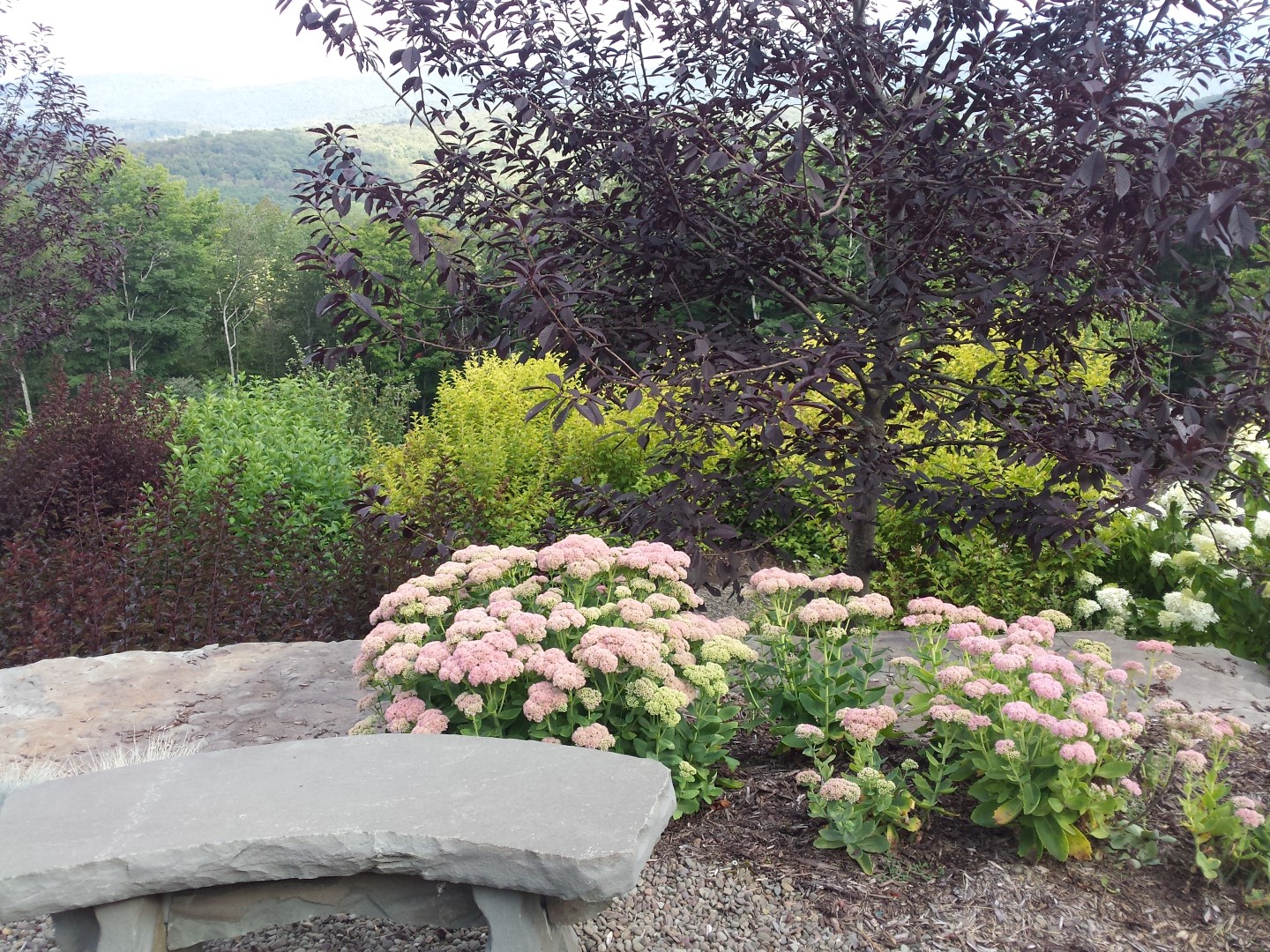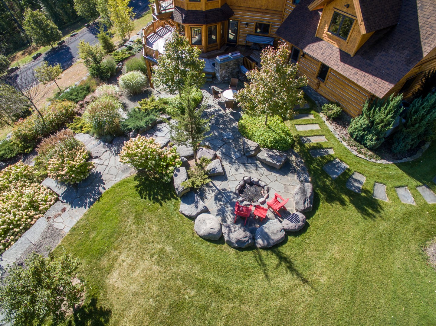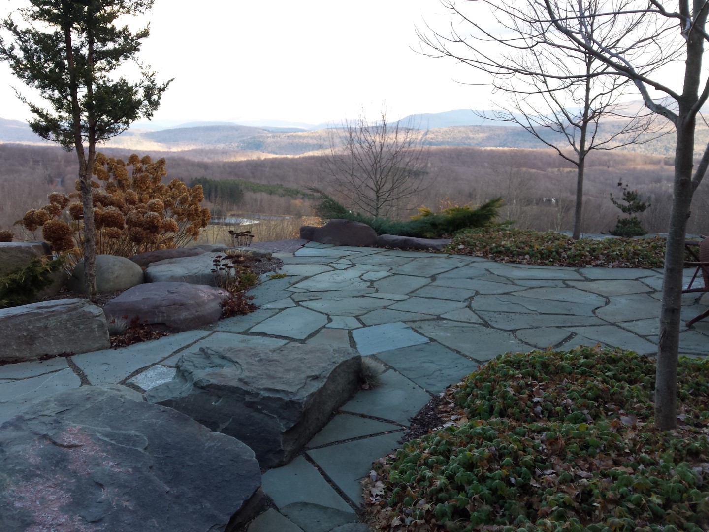 The canvas for this project was carved our of ledge on the side of a mountain in the Catskills. The excavator had to blast to create the space, using the blasted rock to create the enormous retaining walls that provide the shelves for the beautiful log home, gardens and amazing views.